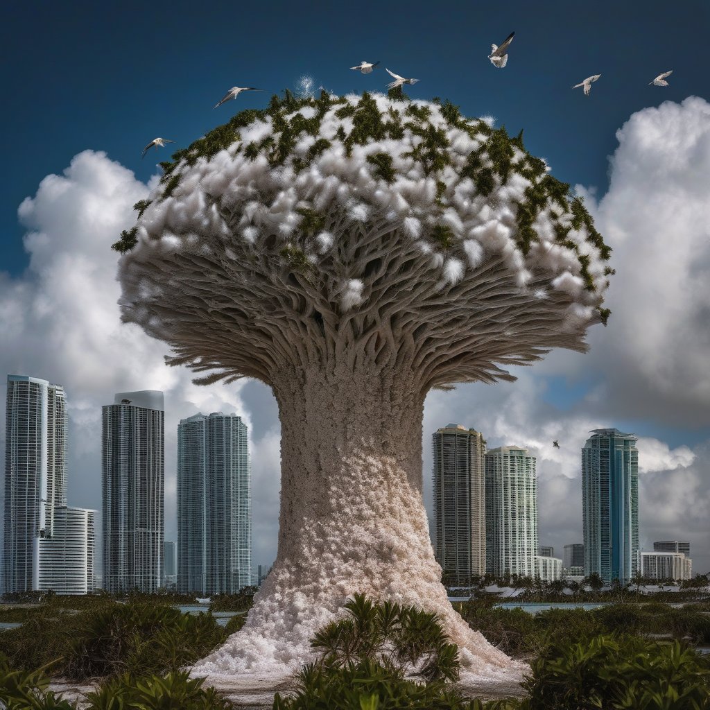 This image comes from a new and evolving series of work in my practice interested in leveraging various LLM image generators with my approach to color grading, image manipulation, and collage to envision a wild future for the city of Miami. In this wild future Miami is underwater, major avenue overgrown with coral and mutant plants growing to gigantic size, and the population has responded to it's emergent climate crisis with a chimeric hybridization. In this future, people have evolved and blended with coral, funghi, and native flora amorphously along a visibly queer ethos. This series then imagine the kind of transhumanist queer future we may bear witness to as our city is engulfed by change and uncertainty.